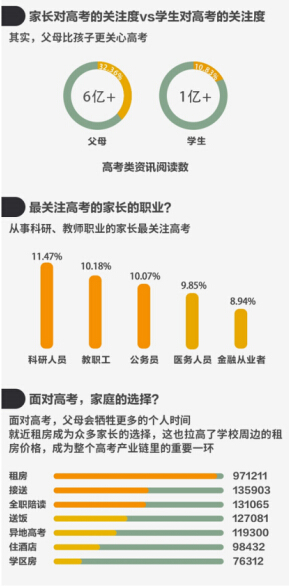 不但如此,中國(guó)父母為了孩子高考會(huì)犧牲更多的個(gè)人時(shí)間。面對(duì)高考,就近租房成為眾多家長(zhǎng)的選擇,這也拉高了學(xué)校周邊的租房?jī)r(jià)格,成為整個(gè)高考產(chǎn)業(yè)鏈里的重要一環(huán)。其次是接送、全職陪讀,也有部分父母選擇送飯、住酒店、買學(xué)區(qū)房等。