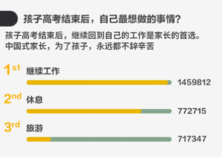 按照UC大數(shù)據(jù)顯示,高考過(guò)后,多數(shù)家長(zhǎng)繼續(xù)回到工作崗位,孩子則選擇旅游以放松身心??梢哉f(shuō),在孩子高考期間蹦緊神經(jīng)、高考過(guò)后立即投入工作的家長(zhǎng),具有明顯的中國(guó)式標(biāo)簽:為了孩子,不辭辛苦。