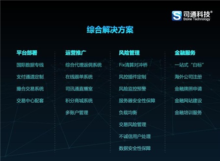 作為當(dāng)前外匯、期權(quán)交易市場優(yōu)秀外匯交易平臺搭建商,司通科技始終堅(jiān)持“技術(shù)改變交易”的理念,走在金融交易軟件開發(fā)創(chuàng)新的前端,可為全球?yàn)榻?jīng)紀(jì)商、會(huì)員單位,甚至從“0”開始的經(jīng)紀(jì)商,提供全方位的辦事,主要包孕: