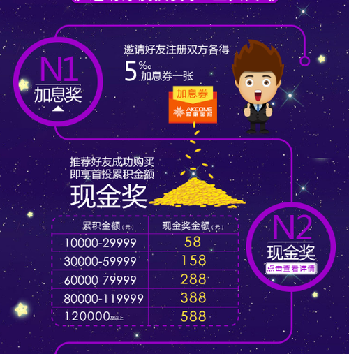 通過活動頁面新注冊用戶可獲得2%和0.5%的加息券;通過活動頁面邀請好友注冊,雙方都可獲得一張0.5%加息券。此類加息券適用于除特殊標(biāo)外所有在線標(biāo)的,任何長短期標(biāo)的產(chǎn)品皆可使用。
