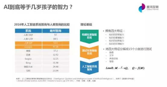 下面我們回到對(duì)人工智能的討論。AI等于幾歲孩子的智力?這是一個(gè)很難回答的問題。比來我找到一篇論文《人工智能的智商和智能等級(jí)劃分研究》,是幾位中國學(xué)者的研究成果,我認(rèn)為是在這個(gè)問題上分析得比較完備的一篇文章,感興趣的同學(xué)可以找來看看。此文把差別年齡的人類的智商和差別的AI平臺(tái)做了比較,結(jié)論是代表AI最高水平的谷歌平臺(tái)綜合來看和人類6歲智商是類似的。