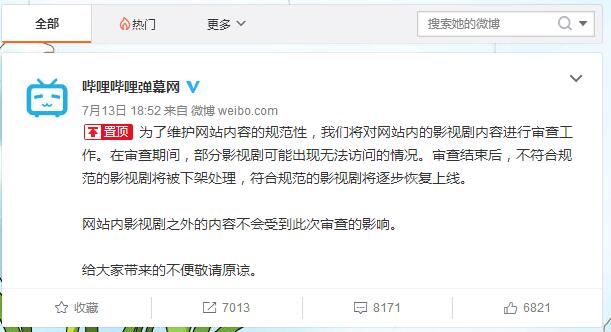 B站官方微博回應(yīng)稱,,正對(duì)內(nèi)容進(jìn)行審查,不符合規(guī)范的影視劇將被下架處理,符合規(guī)范的影視劇將逐步恢復(fù)上線。好在B站官方體現(xiàn),網(wǎng)站內(nèi)影視劇之外的內(nèi)容不會(huì)受到此次審查的影響。