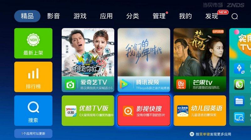 打開智能電視或網(wǎng)絡(luò)機頂盒,連接網(wǎng)絡(luò)后,進入第三方應(yīng)用當(dāng)貝市場()。新手用戶可通過U盤即可在設(shè)備上成功安置當(dāng)貝市場。當(dāng)貝市場安置包直接下載: