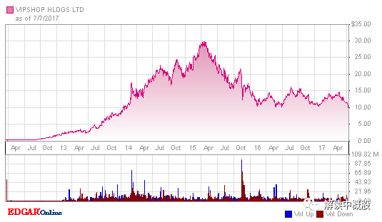實際上唯品會股價曾經(jīng)在2015年4月一度達(dá)到$30的高點,上市以來股價漲幅超過30倍,隨后就開始漫長的下跌過程。截止到本年7月7日,其收盤價為$10.05,僅為最峰值的三分之一。