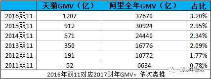 先來看阿里雙11的數(shù)據(jù)。雙11作為國內(nèi)影響力最大的電商促銷節(jié)日,數(shù)據(jù)也最完整??梢钥闯鲭p11貢獻(xiàn)的GMV占比從2011年的0.78%上升到去年的3.2%。