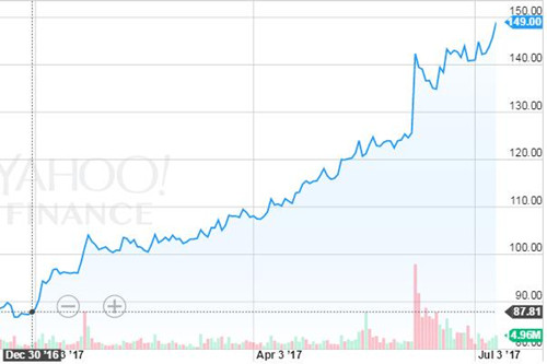 而值得注意的是,阿里巴巴股票本年的漲幅非常大,在2016年的最后一個交易日,也即2016年12月30日,阿里股票的收盤價為87.81美元,而目前為149美元,本年7個月大漲了近70%。(海藍)