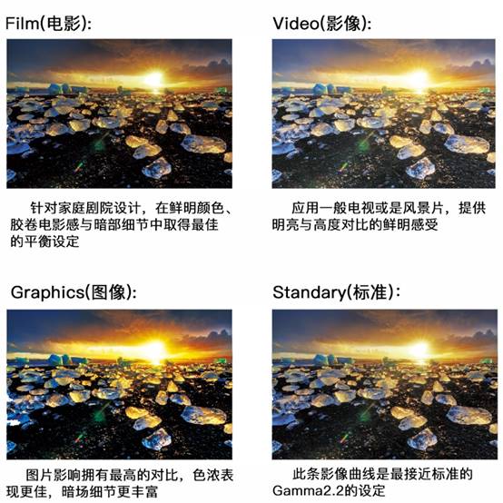 內(nèi)置多種Gamma調(diào)整方案(電影/影像/圖片/尺度),差別使用環(huán)境只需要選擇差別的設(shè)定便可輕松達(dá)到很好的顯示效果。
