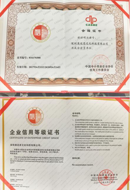 近日,英邁思集團(tuán)正式加入中國中小商業(yè)企業(yè)協(xié)會,并被認(rèn)定為最高等級的AAA級企業(yè)信用等級。好事成雙,在同一時間,英邁思集團(tuán)通過了ISO9001 質(zhì)量體系認(rèn)證。雙喜臨門也彰顯了英邁思集團(tuán)不凡的企業(yè)實(shí)力以及仍在高速發(fā)展的蓬勃?dú)庀ⅰ?/p>
