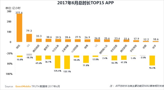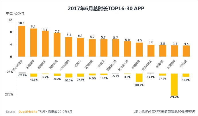 此外,陳訴還分析了 2017 年 6 月份總時(shí)長(zhǎng)APP使用排名,微信、QQ別離位居第一第二名。王者榮耀,今日頭條,快手,嗶哩嗶哩及新浪新聞的總時(shí)長(zhǎng)同比增長(zhǎng)亮眼,以下是 6 月總時(shí)長(zhǎng)TOP30APP