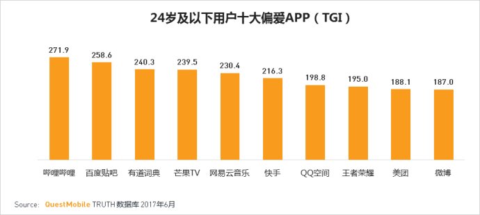 站長(zhǎng)之家(Chinaz.com) 7 月 12 日消息 今日,,數(shù)據(jù)公司QuestMobile發(fā)布了《移動(dòng)互聯(lián)網(wǎng) 2017 年Q2 夏季陳訴》,陳訴分析了移動(dòng)APP的使用情況,其中最受 24 歲用戶偏愛(ài)的APP是嗶哩嗶哩, 6 月份APP使用總時(shí)長(zhǎng)排在第一的則是微信。