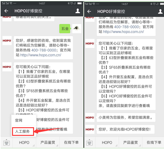 除了網(wǎng)頁端在線溝通的升級(jí),HOPO的微信公眾號(hào)“HOPO好博窗控”同樣也接入了Live800,充分利用Live800 多渠道統(tǒng)一接入的功能,實(shí)現(xiàn)微信和網(wǎng)站訪客咨詢的統(tǒng)一接入,實(shí)現(xiàn)訪客辦事的統(tǒng)一視圖、統(tǒng)一辦事、統(tǒng)一監(jiān)控和統(tǒng)一信息流的一體化辦理。