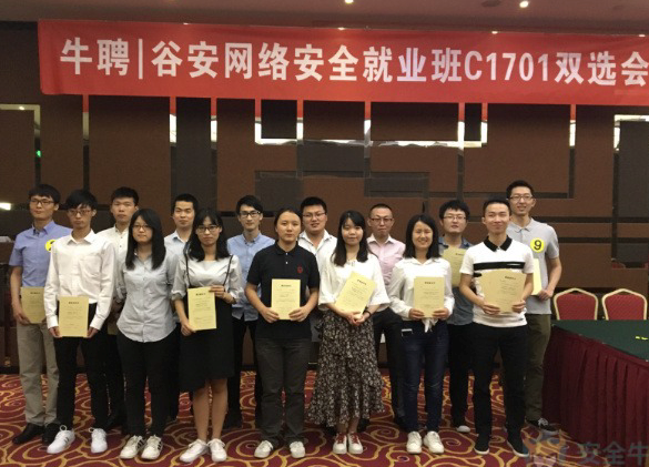 2017 年 6 月 8 日,安適牛與谷安天下人才就業(yè)班聯(lián)手,在北京麗亭華苑酒店召開了首屆“牛聘|谷安網(wǎng)絡(luò)安適就業(yè)班C1701 雙選會”。消息一經(jīng)發(fā)出,就收到眾多企業(yè)報名參會,但是由于就業(yè)班學(xué)生數(shù)量有限,最后只能根據(jù)報名先后挨次挑選出綠盟科技、聯(lián)想集團(tuán)、中國軟件、太極股份、三零衛(wèi)士、志翔科技、梆梆安適等十余家優(yōu)秀安適企業(yè)參與本次“雙選會”招聘。