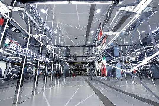 如今的上海人民廣場地鐵站通道可謂是光芒四射,鏡面材質(zhì)的通道在燈光的映襯下顯得時尚酷炫。而通道兩邊的燈箱中,一邊是帥氣凌人的陳偉霆,代表著OPPO