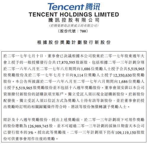 【TechWeb報道】7月11日消息,繼騰訊18周年慶給每位騰訊員工發(fā)300股騰訊股票之后,騰訊控股發(fā)布公告,發(fā)行1787萬新股獎勵10800名員工。根據(jù)7月10日騰訊控股收盤股價271.6港元計算,這筆獎勵價值48.5億港元(42.2億元人民幣)。
