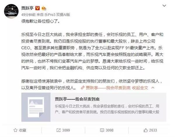 樂視控股執(zhí)行董事賈躍亭也發(fā)布聲明,對樂視近期遭遇的危機(jī)作出回應(yīng),他體現(xiàn):“樂視至今日之巨大挑戰(zhàn),我會承擔(dān)全部的責(zé)任,會對樂視的員工、用戶、客戶和投資者盡責(zé)到底。”
