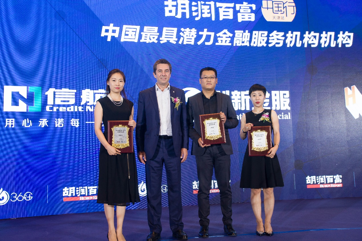 儀式的尾聲,上演本次會議的重頭戲,胡潤先生為了感謝皇貴資產(chǎn)對地區(qū)經(jīng)濟發(fā)展作出的杰出貢獻,向皇貴資產(chǎn)頒布了《 2017 胡潤百富中國最具投資價值新星企業(yè)百強榜天津 50 強》和《中國最具潛力金融辦事機構(gòu)》兩項重量級獎項,皇貴資產(chǎn)CEO夏雅娜女士代表公司上臺領(lǐng)獎,并與胡潤先生合影留念。