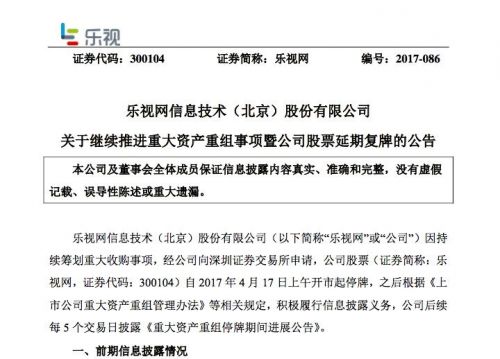 本次交易公司擬以發(fā)行股份及支付現(xiàn)金方式購買標(biāo)的公司100%股權(quán),同時(shí)募集配套資金。近日,樂視網(wǎng)與樂視控股簽署了《收購意向協(xié)議》,雙方約定將繼續(xù)推進(jìn)本次交易,上市公司將在首次停牌之日(2017年4月17日)起6個(gè)月內(nèi)召開董事會(huì)審議本次重組方案。