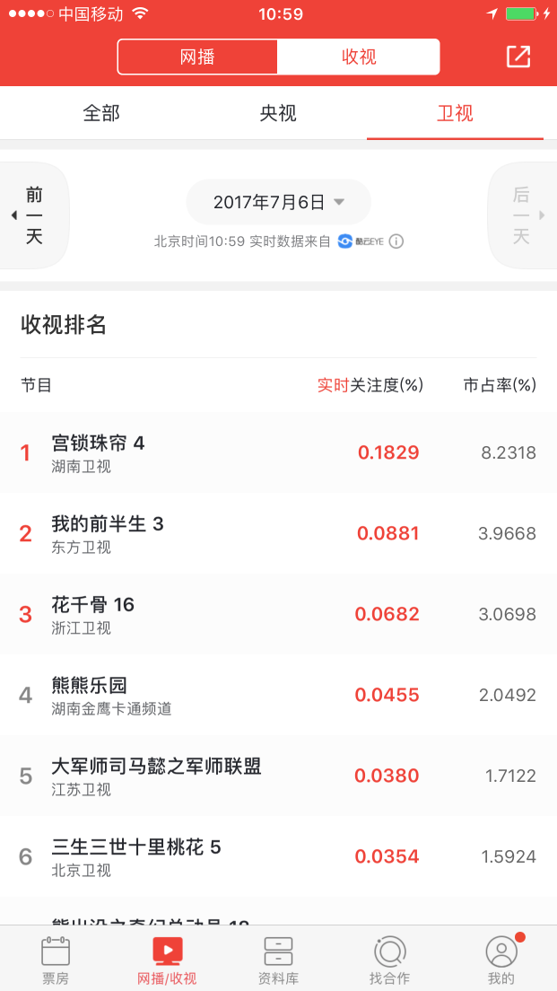 7 月 4 日,電視劇《我的前半生》開播,貓眼專業(yè)版數(shù)據(jù)顯示該劇在開播兩日內(nèi)就以0.0881%的實時關注度和3.6794%的市占率突出重圍,躥升到衛(wèi)視收視第二,同樣在網(wǎng)絡上收獲好評,網(wǎng)播量也在兩日內(nèi)突破 2 億。