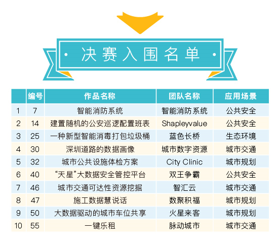 7月4日,經(jīng)過5個月的等待和鏖戰(zhàn),智能消防系統(tǒng)、Shapleyvalue、藍色長橋、城市數(shù)字資源、City Clinic、雙王爭霸、智匯云、數(shù)聚積福、火星來客、脈動城市十支隊伍闖進決賽,2017深圳“中國電科杯”城市數(shù)據(jù)創(chuàng)新大賽(以下簡稱“中國電科杯”數(shù)據(jù)大賽)10強正式誕生。