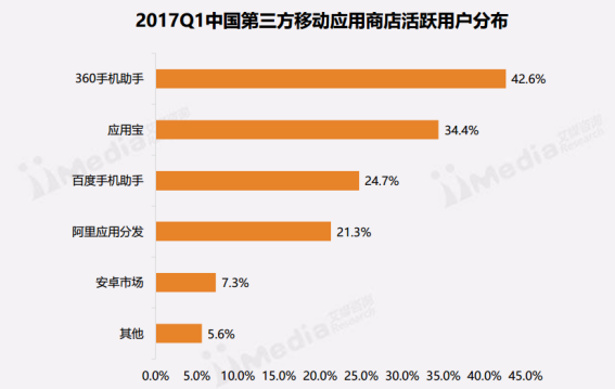 近日,全球領(lǐng)先的新經(jīng)濟(jì)行業(yè)數(shù)據(jù)挖掘和分析機(jī)構(gòu)艾媒咨詢權(quán)威發(fā)布《2017Q1 中國(guó)移動(dòng)應(yīng)用商店季度監(jiān)測(cè)陳訴》(以下簡(jiǎn)稱“陳訴”)。陳訴顯示, 2017 年第一季度中國(guó)第三方移動(dòng)應(yīng)用商店活躍用戶規(guī)模達(dá)4. 56 億人,繼續(xù)連結(jié)低速增長(zhǎng)。而在活躍用戶分布方面, 360 手機(jī)助手以42.6%的比例連結(jié)領(lǐng)先地位。而應(yīng)用寶和百度手機(jī)助手則別離位列二、三,為34.4%和24.7%,豌豆莢占11.5%,與PP助手和安卓市場(chǎng)比擬優(yōu)勢(shì)并不明顯。