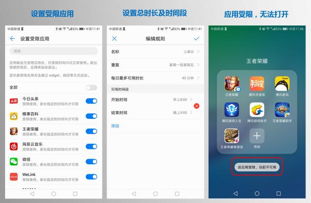 就拿《王者榮耀》來說,在華為手機(jī)上開啟學(xué)生模式后,應(yīng)用安置需要家長允許,家長首先可以選擇是否讓孩子安置這款游戲。通過應(yīng)用使用限時功能,讓孩子在家長規(guī)定的時間段,才能玩游戲。好比放學(xué)后,晚上 8 點(diǎn)到 9 點(diǎn)才能玩《王者榮耀》。所有涉及應(yīng)用安置和重置手機(jī)的操作,都需要家長密碼才能完成。