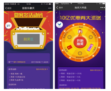 微客多一品一碼的營(yíng)銷功能就是專為企業(yè)解決這類疑難雜癥,購(gòu)買行為不該該是結(jié)束,而是開始。微客多一品一碼具有大轉(zhuǎn)盤、積分、刮刮樂(lè)、抽紅包等營(yíng)銷形式,生成的二維碼均有獨(dú)立且僅有一次參與活動(dòng)的機(jī)會(huì)。用戶只需微信掃碼,即可關(guān)注商家微信公眾號(hào)并參與活動(dòng),通過(guò)趣味抽獎(jiǎng)形式可贈(zèng)予顧客卡券、積分、紅包等獎(jiǎng)勵(lì)刺激二次消費(fèi);同時(shí),活動(dòng)碼可快速將線下粉絲引流至線上,從而帶動(dòng)線上商城的運(yùn)營(yíng)。