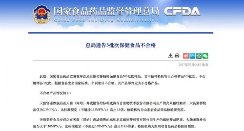 【TechWeb報道】7月4日消息,國家食品藥品監(jiān)督辦理總局今日發(fā)布通告稱,近期組織監(jiān)督抽檢保健食品106批次樣品,其中抽樣檢驗項目合格樣品103批次,分歧格樣品3批次。按照食品安適國家尺度,,個別項目分歧格,其產(chǎn)品即判定為分歧格產(chǎn)品。