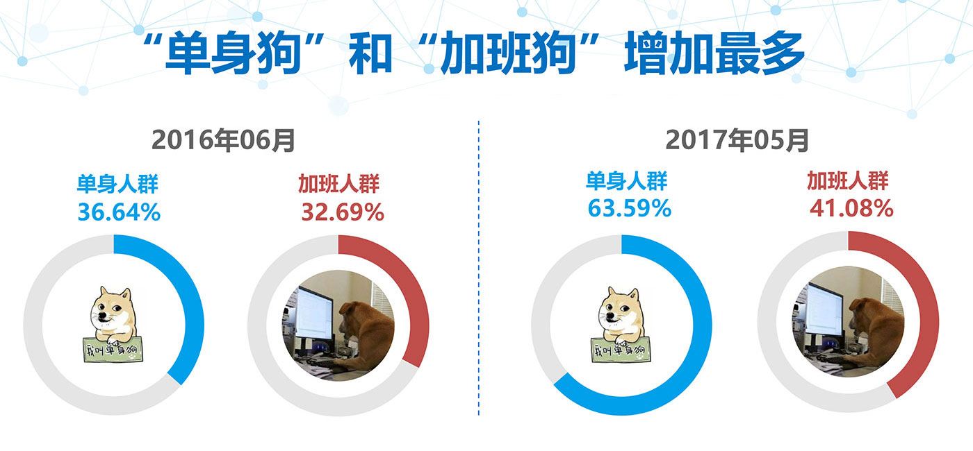 “單身狗”和“加班狗”增加最多值得一提的是,“單身狗”和“加班狗”兩類人群增速明顯。單身人群的占比從去年 6 月的36.64%上升到63.59%;加班人群的占比從32.69%上升到41.08%。