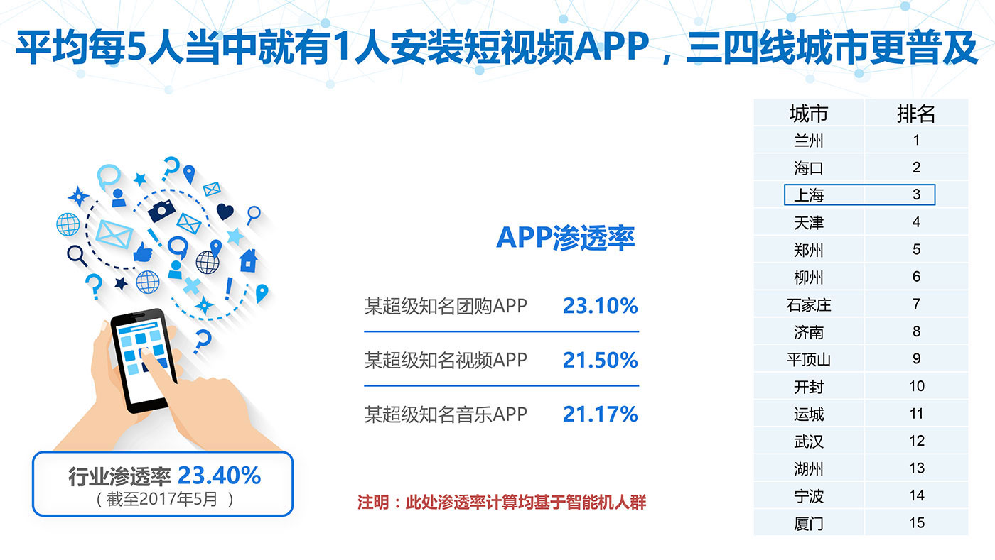個(gè)推大數(shù)據(jù)顯示,截至 2017 年 5 月,短視頻行業(yè)滲透率達(dá)到了23.4%,相當(dāng)于平均每 5 人中至少就有 1 人安置短視頻類APP。就城市分布來說,短視頻在三四線城市更普及,即使在覆蓋最多的前十大城市里,也僅有上海屬于一線城市,其他九個(gè)城市別離是蘭州、???、天津、鄭州、柳州、石家莊、濟(jì)南、平頂山和開封。