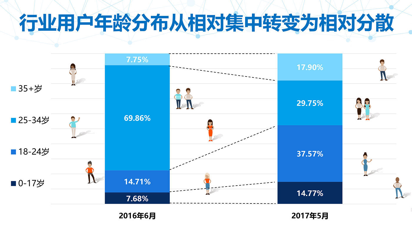 此外,短視頻行業(yè)用戶的年齡分布也從相對集中轉(zhuǎn)變?yōu)橄鄬Ψ稚ⅲ妄g化趨勢更加明顯。截至 2017 年 5 月,0- 17 歲用戶占比從7.68%上升為14.77%,18- 24 歲用戶占比從14.71%上升到35.57%,25- 34 歲用戶占比則從69.86%下降到29.75%, 35 歲以上的用戶占比從7.75%上升到17.9%。