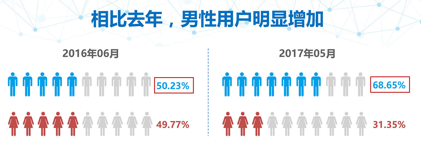 從用戶性別屬性來看,短視頻男性用戶占比明顯增加。比擬去年同期,,本年 5 月男性用戶的占比從50.23%上升到68.65%,男女比例從相對平衡轉(zhuǎn)變?yōu)榻?:3。