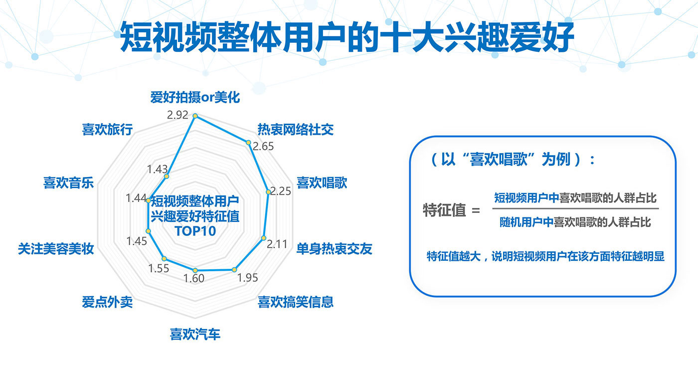 短視頻整體用戶的興趣喜好也有十分明顯的特征。個(gè)推大數(shù)據(jù)顯示,短視頻用戶排名前十的興趣喜好特征別離是喜好拍攝和美圖,熱衷網(wǎng)絡(luò)社交,喜歡唱歌,單身人群熱衷交友,喜歡搞笑信息,喜歡汽車,愛點(diǎn)外賣,關(guān)注美容美妝,喜歡音樂,喜歡旅行。這些遠(yuǎn)高于普通人群的興趣偏好顯示,短視頻用戶相對更富有冒險(xiǎn)精神,勇于嘗試新鮮事物,屬于典型的移動(dòng)互聯(lián)網(wǎng)前沿人群。