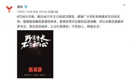 7月2日,易到用車再次在其官方微博中體現(xiàn),6月30日開始,超過40萬車主已經(jīng)成功提現(xiàn),隨著新戰(zhàn)略投資者的道理,新易到將開啟新的運(yùn)營(yíng)戰(zhàn)略。
