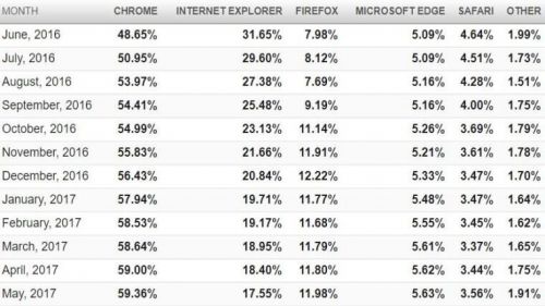 他們給出的占比列表顯示去年年中的時(shí)候,谷歌Chrome瀏覽器還沒有占據(jù)市場(chǎng)對(duì)折以上,但很快就穩(wěn)步增長(zhǎng),,截止到本年四月份,已經(jīng)占有了59%的市場(chǎng)份額,絕對(duì)一家獨(dú)大的情況,不過這也可以理解,在瀏覽器種類很多的國(guó)內(nèi),也有大量Chrome用戶存在。