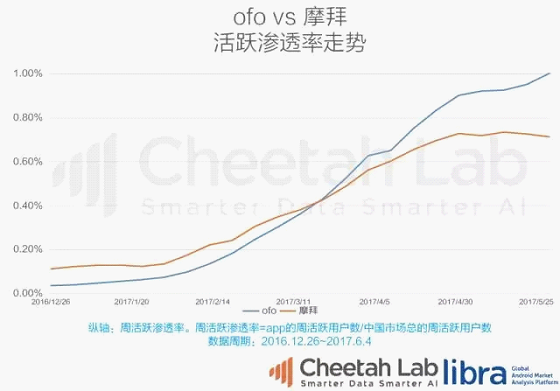 獵豹全球智庫發(fā)布的數(shù)據(jù)顯示, 2017 年 3 月之前摩拜活躍滲透率始終領先于ofo,直到本年 3 月開始,ofo活躍滲透率增速更為明顯,且開始持續(xù)大幅度領先摩拜單車,至今領先優(yōu)勢十分明顯,且呈現(xiàn)出強勁的增長態(tài)勢?;钴S滲透率更高,意味著比擬摩拜,有更多的用戶使用ofo。從最新數(shù)據(jù)來看,摩拜活躍滲透率增速在 4 月之后明顯較為遲緩。