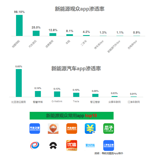 3) 國產(chǎn)新能源汽車控制app的滲透率為1.1%;電動(dòng)車充電類app的滲透率為0.9%;新能源汽車app中,比亞迪云辦事app的滲透率最高