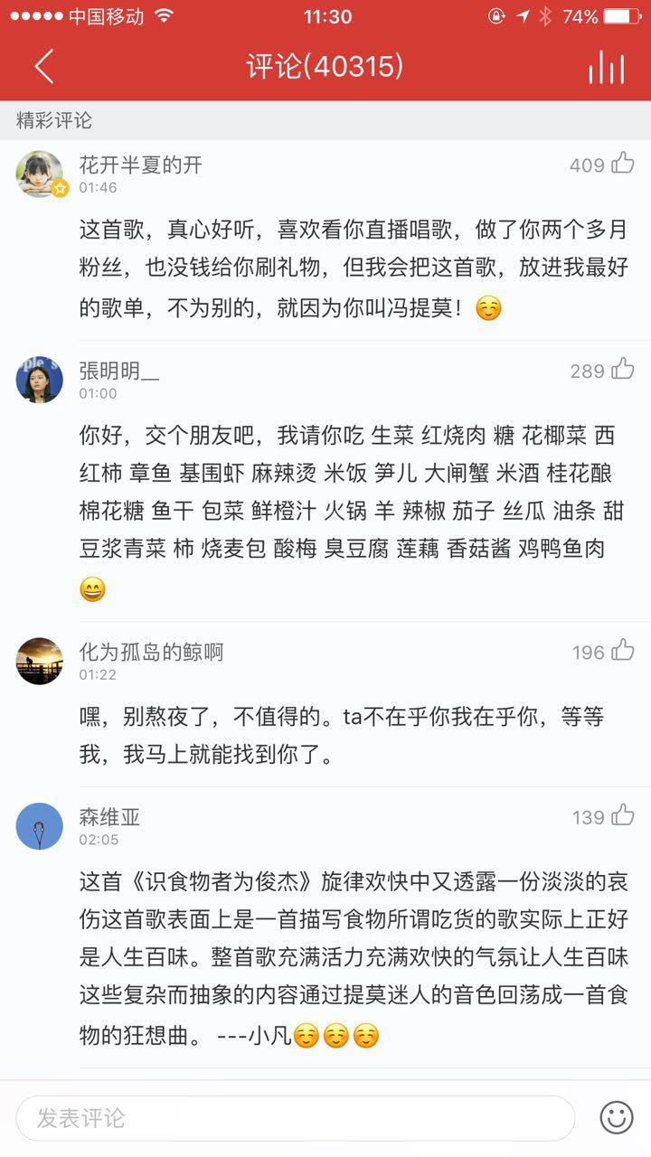 網(wǎng)易云音樂網(wǎng)友“聽馮提莫長大的迷弟”坦言:“始于顏值,終于才華。我不是一個喜歡看直播的人不是一個喜歡聽歌的人最初是在哪里看到了你的照片,照片里的你在笑,像太陽一樣。當時就覺得,哪怕是微不足道的我也想守護著你這份笑容呢。我開始看你的直播,不愛聽音樂的我把你的每一首歌都單曲循環(huán)過,聽你的歌心里總是能感到暖意,支持提莫,愛你。”