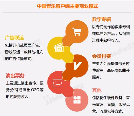 音樂客戶端作為移動音樂產(chǎn)業(yè)的關(guān)鍵內(nèi)容平臺,同時與其他音樂細分行業(yè)存在鏈接關(guān)系。在版權(quán)掩護持續(xù)加強的基礎(chǔ)上,音樂客戶端已經(jīng)發(fā)展出較成熟用戶付費模式,主要以會員及數(shù)字專輯為主;同時,作為移動互聯(lián)網(wǎng)產(chǎn)品,音樂客戶端也以廣告聯(lián)運作為主要商業(yè)模式之一;作為移動互聯(lián)網(wǎng)場景下的音樂產(chǎn)業(yè)和用戶之間的連接通道,音樂客戶端還在積極拓展包孕表演、硬件、版權(quán)、宣發(fā)等多種商業(yè)模式。