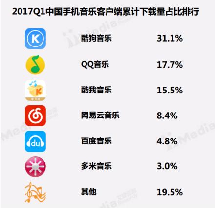 Research(艾媒咨詢)數(shù)據(jù)顯示,截至 2017 年第一季度,騰訊音樂娛樂集團(簡稱TME)的酷狗音樂、QQ音樂、酷我音樂別離以31.1%、17.7%、15.5%位居累計下載量占比排行榜前三名。TME集團累計下載量占比超六成,成為中國手機音樂客戶端市場“三巨頭”。