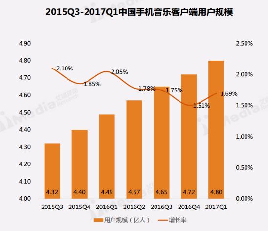 Research(艾媒咨詢)數(shù)據(jù)顯示,2017Q1 中國手機音樂客戶端用戶規(guī)模達4. 80 億人,,較2016Q4 增長1.69%,增長率略有上升。艾媒咨詢分析師認為,2017Q1 多家廠商進行版權(quán)資源布局,手機音樂客戶端推出新版本功能吸引用戶,中國手機音樂客戶端用戶規(guī)模增幅略有上漲,但用戶規(guī)模整體趨于飽和,特色辦事功能與優(yōu)質(zhì)的聽歌體驗成為手機音樂客戶端留存用戶的關(guān)鍵。