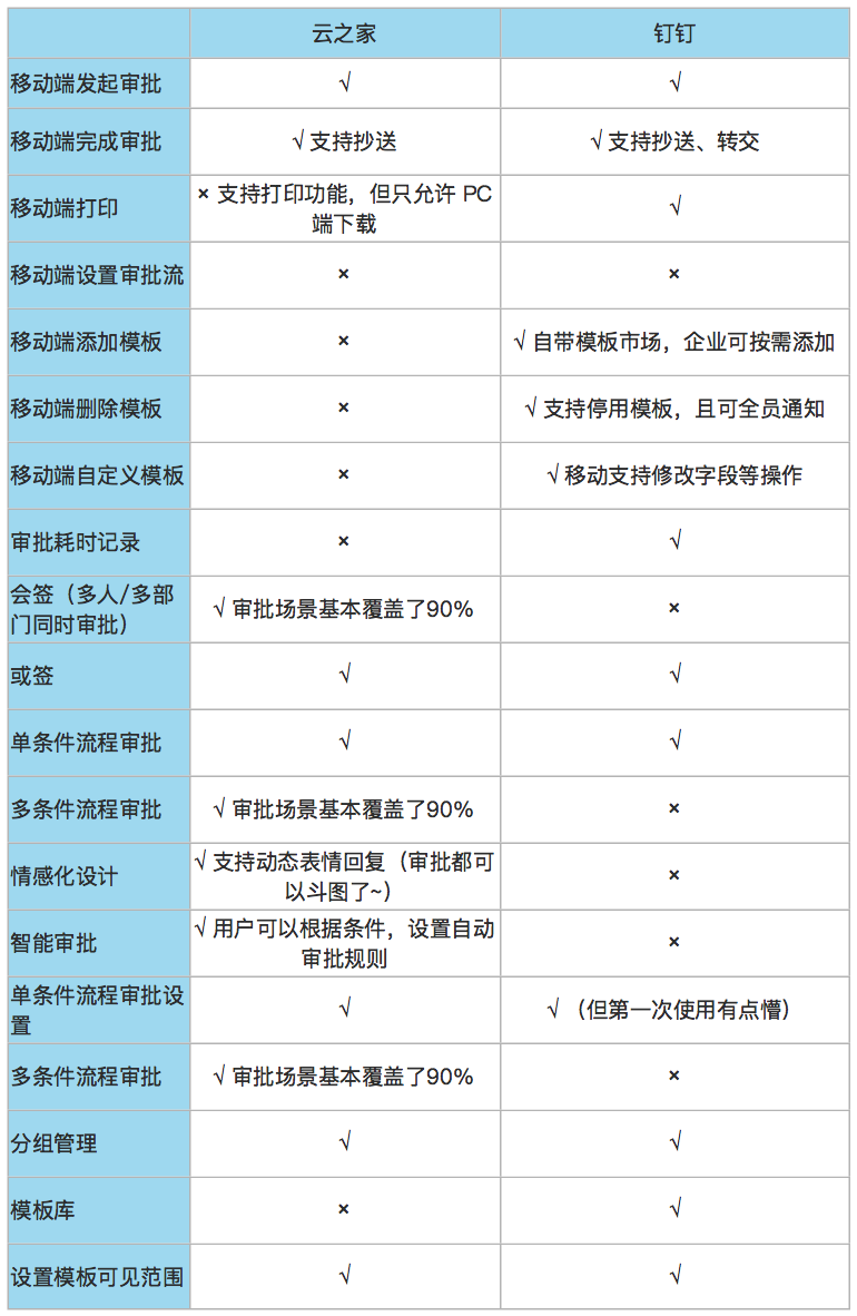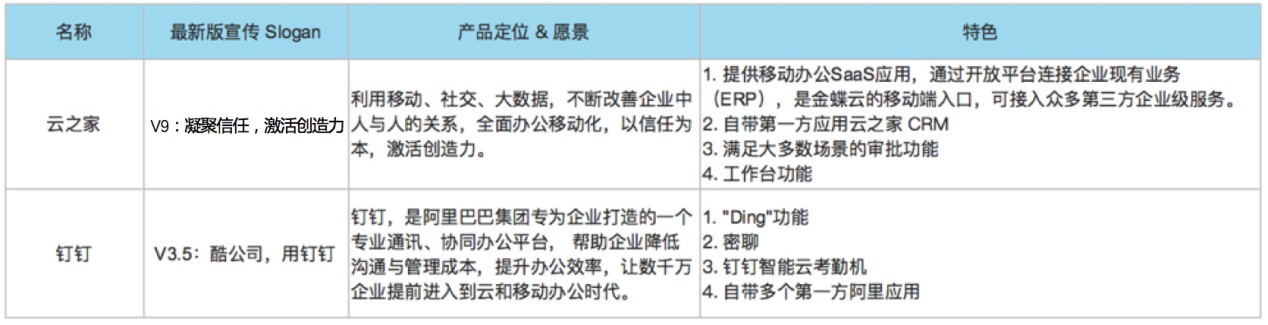 釘釘和云之家都在六月份舉辦了發(fā)布會。釘釘發(fā)布了3. 5 版本,標語是“酷公司,用釘釘”;云之家公布了V9 版本,提出了“凝聚信任,激活創(chuàng)造力”的標語。雙方特色總結(jié)如下: