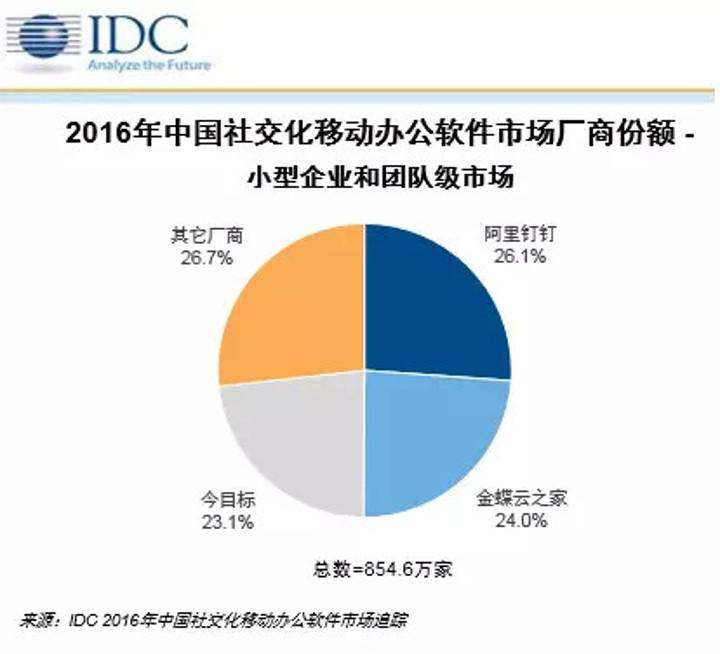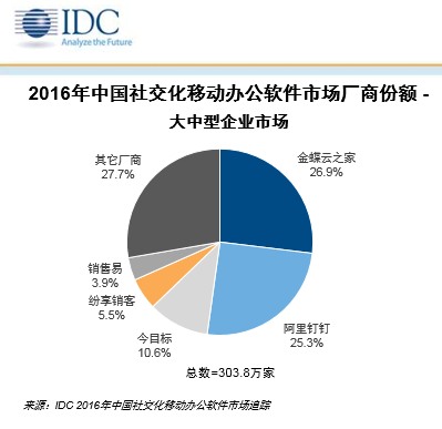 據(jù)《IDC2016 中國社交化移動辦公軟件市場跟蹤陳訴》顯示,截止 2016 年末,中國社交化移動辦公軟件市場累計注冊用戶達到1. 6 億人,累計企業(yè)用戶達到1158. 4 萬家。在大中型企業(yè)市場(企業(yè)員工人數(shù)在250