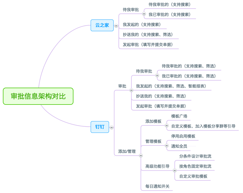 另一方面,從結(jié)構(gòu)層的角度看,云之家與釘釘移動端在信息架構(gòu)上沒有太大的差別。只是釘釘多了模板辦理模塊: