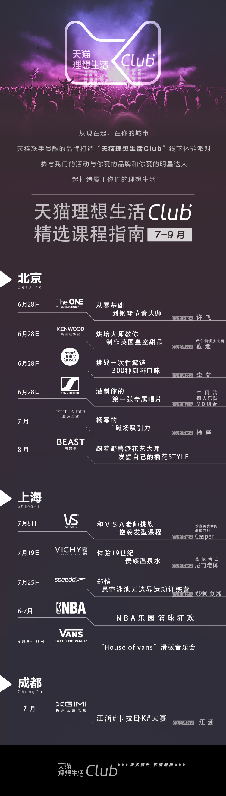 天貓抱負(fù)生活CLUB,是由天貓聯(lián)手最符合消費(fèi)趨勢(shì)、引領(lǐng)消費(fèi)不雅觀念的品牌商共同發(fā)起的線下生活方式巡回體驗(yàn)活動(dòng),,為阿里會(huì)員提供此前極為難得的品牌尊享辦事,包孕音樂(lè)、藝術(shù)、明星見面會(huì)、專業(yè)技能訓(xùn)練等。