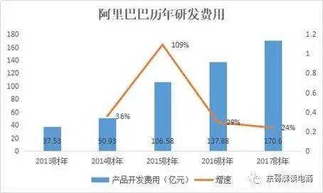 從2013年財(cái)報(bào)看,除了工資等人工開(kāi)銷外,阿里巴巴的研發(fā)費(fèi)用還包孕了基礎(chǔ)設(shè)施的建設(shè)、維護(hù)和增強(qiáng)。以及各類應(yīng)用程序、操作系統(tǒng)、軟件、移動(dòng)端產(chǎn)品和辦事平臺(tái)。從2014年上市以來(lái),阿里巴巴的研發(fā)費(fèi)用連結(jié)不變?cè)鲩L(zhǎng)。