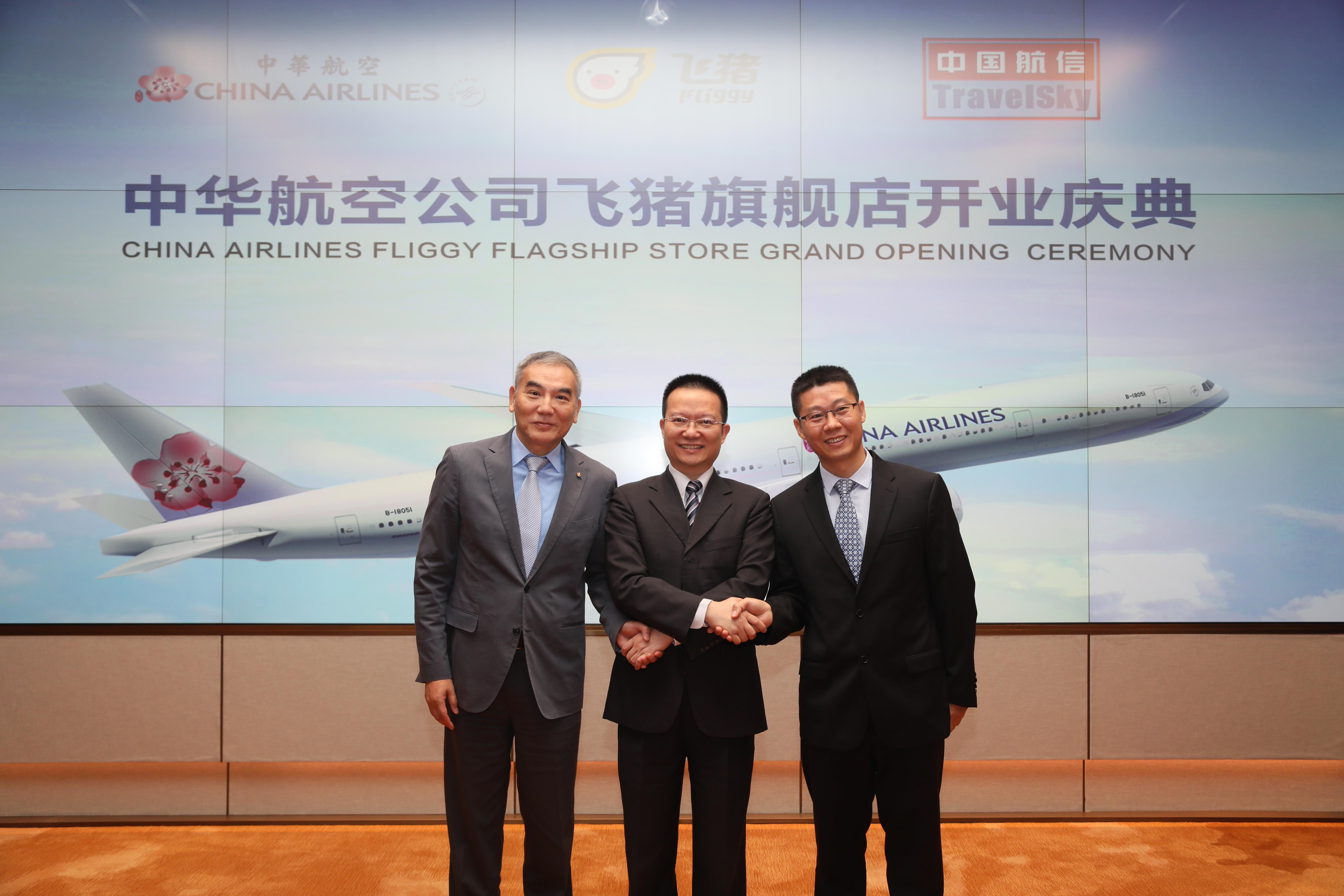 中華航空大陸地區(qū)首席代表羅皓明、飛豬副總裁鄭偉斌、中國(guó)航信全球分銷系統(tǒng)副總經(jīng)理金勇