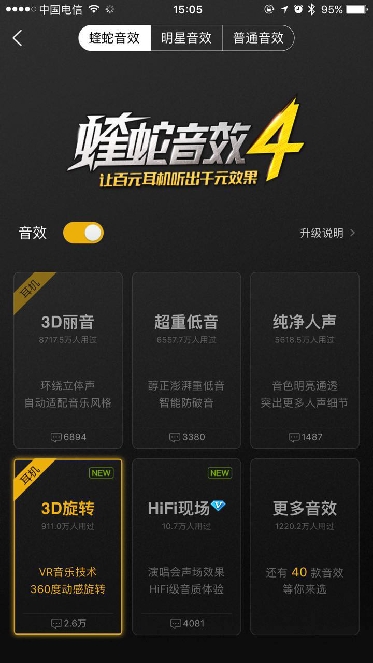 再來看此次產品升級推出的三大特色音效——“3D旋轉”、“HiFi現場”、“明星音效”,升級的VR音樂技術、HiFi現場等技術使得用戶所感受到的音樂效果更加分。三款音效別離可以呈現更極致刺激的3D環(huán)繞立體音、更傳神的模擬演唱會現場,以及在聽某個明星的單曲時可以實現智能匹配相對應的明星音效,更極致地還原高品質音樂原來的樣子。