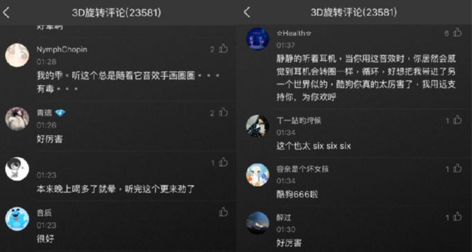 其中,“3D旋轉”是本次升級后最受用戶關注和熱議的一款音效,目前平臺已有超 910 萬用戶搶先體驗這款提供“ 360 度旋轉”神奇體驗的音效,而評論區(qū)也幾乎被用戶攻陷,超2. 6 萬條用戶評論一舉打破蝰蛇音效最高評論記錄。