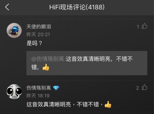 而此次升級酷狗還推出了燒友聽音樂利器“HiFi現場”音效,通過傳神還原演唱會聲場效果給燒友們帶來HiFi級音質體驗??峁窡褌円埠敛谎陲棇Α癏iFi現場”音效的喜愛,紛紛體現“音效清晰明亮,不錯不錯”。