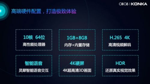 發(fā)布會上了解,咪咕電視由國內(nèi)電視行業(yè)巨頭康佳提供頂級外不雅觀設(shè)計和影音體驗。配置規(guī)格方面,采用10核64位高性能處理器,內(nèi)置1GB內(nèi)存+8GB閃存,,支持H265 4K高清視頻解碼能力并支持3D、VR等特色內(nèi)容。